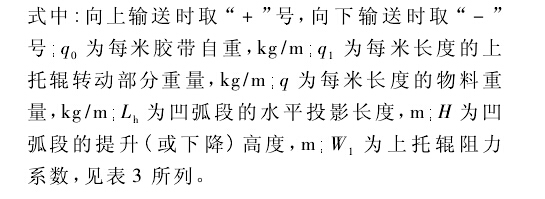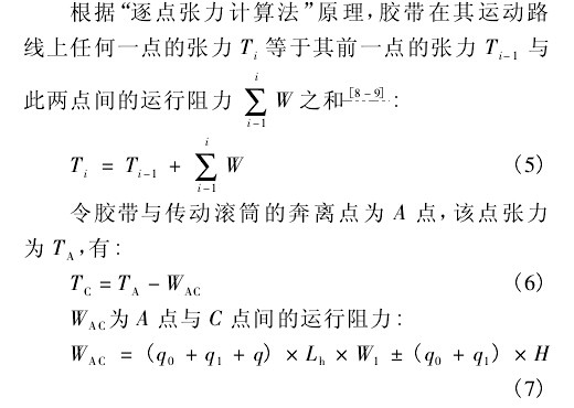 平穩(wěn)運行。實際的設(shè)計計算表明,對于一般的皮帶輸送機凹弧段半徑的計算,式( 1) 的計算結(jié)果可滿足要求。但在某些條件下,式( 2) 、( 3) 的計算結(jié)果也會大于式( 1) 的所得,從而導(dǎo)致半徑過大給工藝布置帶來一定的困難。查式( 2) 、( 3) ,可采取加大拉緊力的方法以增大Tc值,使其計算結(jié)果得到減小。下面將討論凹弧段起始點張力Tc的計算方法。