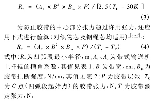 由式1可計算得出凹弧段的最小半徑。但是當膠帶的張力過低時,膠帶的邊緣處有可能產(chǎn)生皺曲,將無法保證皮帶輸送機的安全運行,因此需對該半徑值進行必要的校核。鑒于目前國內(nèi)尚無成熟的計算公式可循,建議采用美國輸送設(shè)備制造商協(xié)會聯(lián)合會推薦的公式對最小半徑進行驗算,以保證膠帶具有足夠張力,避免在凹弧段處的膠帶邊緣出現(xiàn)零張力'對織物芯膠帶,用下式進行驗算: