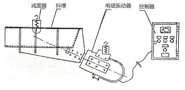 電磁振動(dòng)給料機(jī)的激振器電磁線圈的電流是經(jīng)過單相半波整流的,當(dāng)線圈接通后在正半周內(nèi)有電流通過,銜鐵和鐵芯之間便產(chǎn)生了脈沖電磁力互相吸引,這時(shí)槽體向后運(yùn)動(dòng),激振器的主彈簧發(fā)生變形儲(chǔ)存了一定的勢能,在負(fù)半周線圈中無電流通過,電磁力消失,主彈簧釋放能量,使銜鐵和鐵芯朝反方向離槽體向前運(yùn)動(dòng)。于是電磁振動(dòng)給料機(jī)以交流電源的頻率往復(fù)振動(dòng),由于槽體的底平面與激振力作用線有一定的夾角,因此槽體的物料沿拋物線的軌跡連續(xù)不斷地向前運(yùn)動(dòng)。調(diào)整整流電壓的高低,即可控制設(shè)備的送料量。